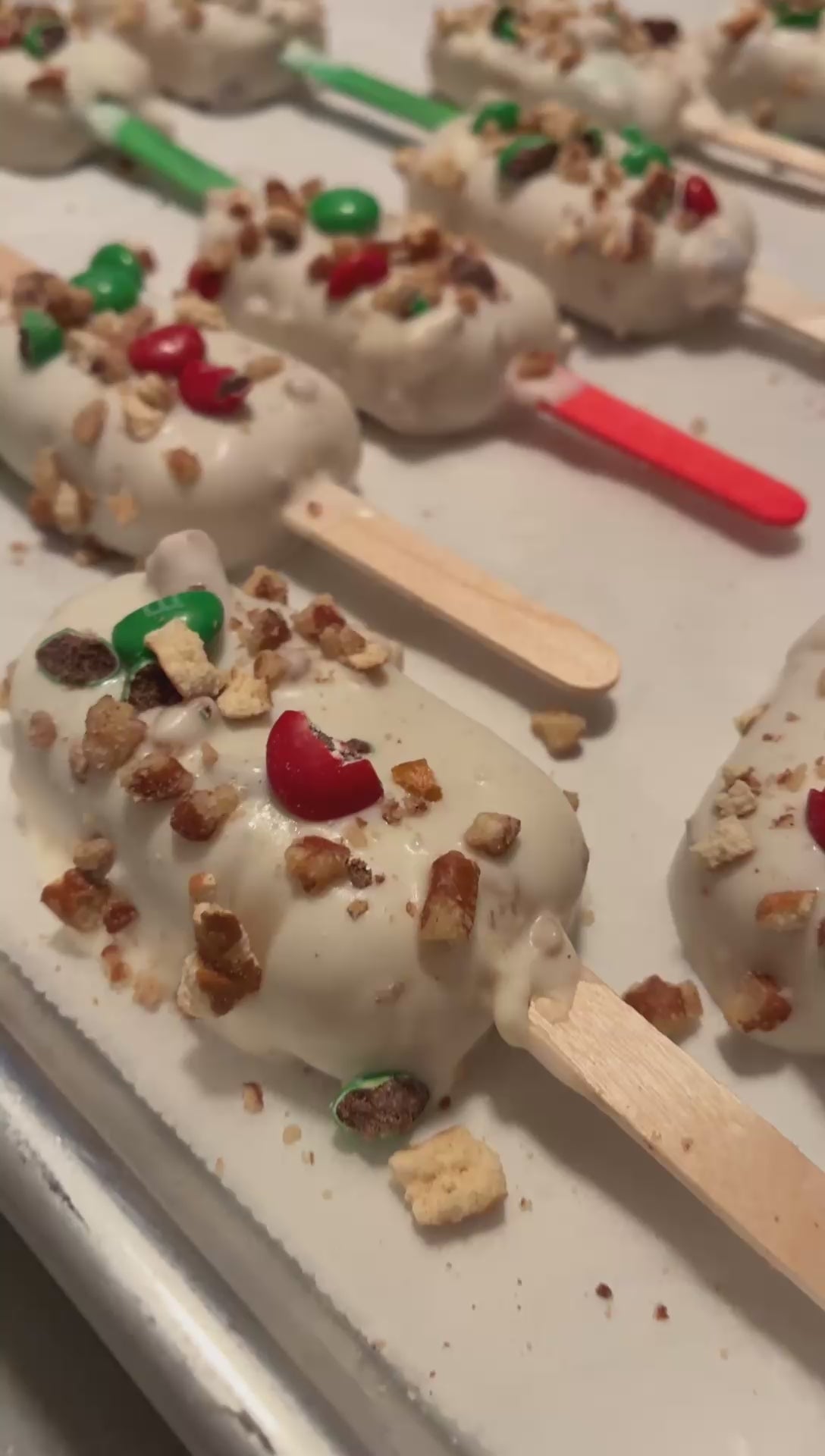 These Christmas Workshop Cakesickles are the ultimate holiday treat—rich, festive, and made to impress. Each cakesickle starts with moist butter yellow cake, baked from scratch, crumbled, and blended to perfection. It’s then hand-dipped in creamy white chocolate and finished with a crave-worthy mix of crunchy pretzels, toasted pecans, and colorful M&M’s for the perfect sweet-salty holiday bite.
