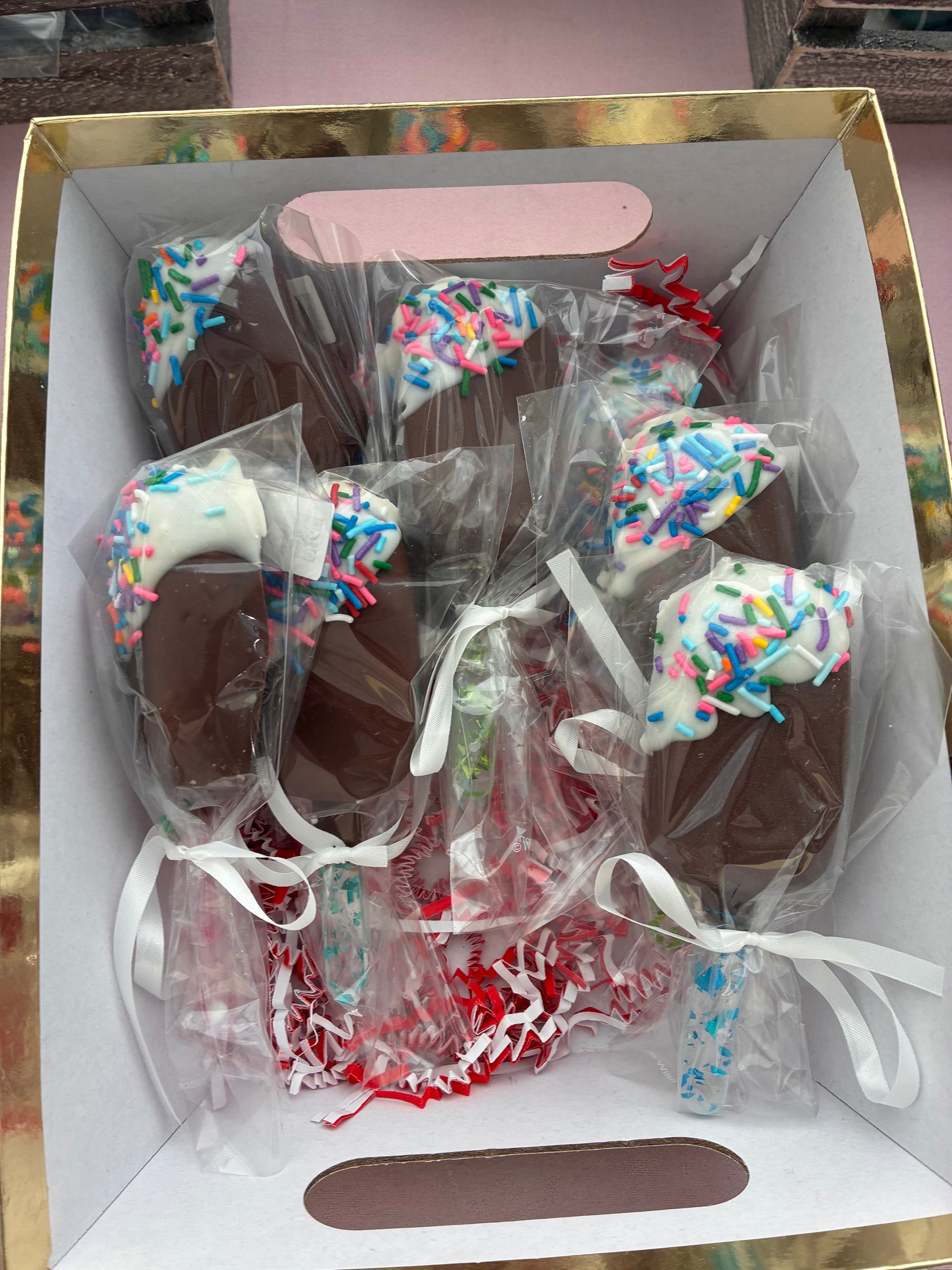 Ultra-moist funfetti cake blended with vanilla frosting and marshmallow fluff, packed with sprinkles and mini chocolate chips, then dipped in a smooth chocolate shell and finished with festive sprinkles. Rich, nostalgic, and seriously fun — a birthday on a stick.